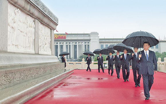 2013年10月1日,习近平等党和国家领导人冒雨瞻仰人民英雄纪念碑