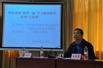 为全面贯彻落实中央和自治区;两学一做;学习教育指示精神,切实把;两学一做;学习教育引向深入,5月19日,自治区经信委联合吴忠市工信局、利通区工信局、金积工业园区管委会、宁夏恒丰集团、吴忠仪表股份有限公司等单位和企业,组织开展了以;‘两学一做’激活力,聚力发展促转型;为主题的经信系统;两学一做;学习教育五级联学活动。联学活动包括调研观摩、;大党课;集中辅导、学习体会交流、调研座谈等环节。经信委各党支部书记、各联学单位党员代表90多人参加了联学。