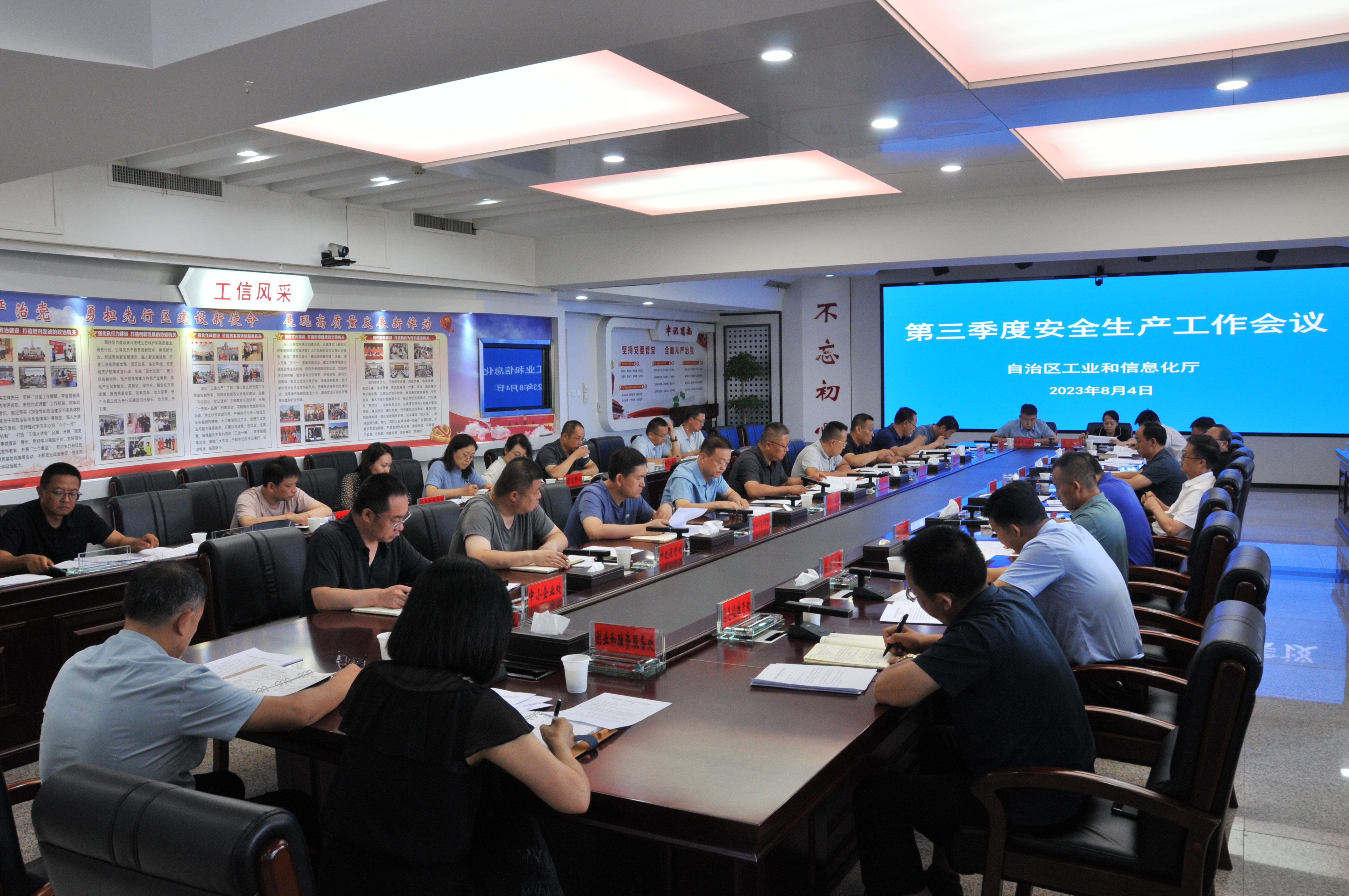 会议再次传达学习自治区党委十三届四次全会精神暨梁言顺书记、雷东生常委讲话,专题传达自治区安委会2023年第四次全体会议精神、自治区安委会2023年第五次全体(扩大)会议精神,听取了大数据与软件产业处汇报2023中国算力(基础设施)大会第二届“西部数谷”算力产业大会期间安全防范工作,厅安委办通报近期工业领域安全生产工作开展情况,说明“1+37+8”系列文件责任分工。刘红宁同志对近期工业领域安全生产工作进行安排部署,对全面做好灾害防范工作应对提出具体要求。