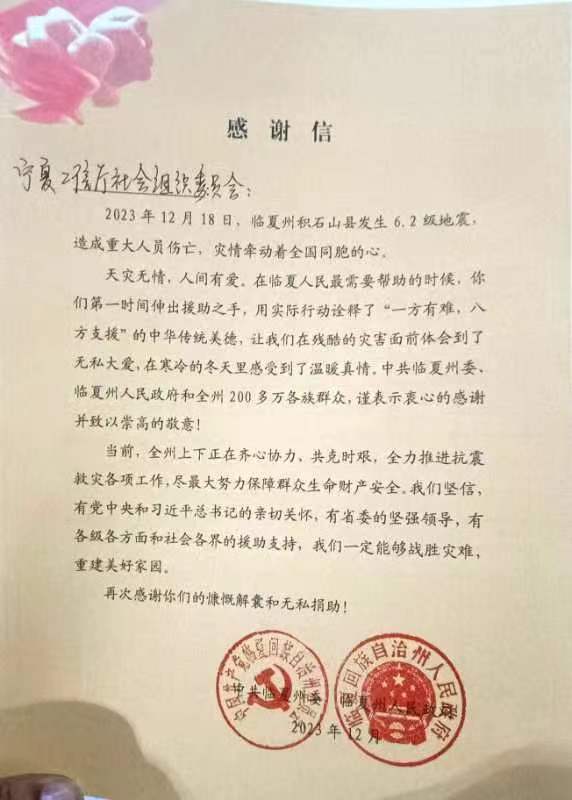 我厅社会组织党委同时收到了来自积石山县红十字会的感谢信,对小鸭看看 和社会组织党委及各党支部的支援表示感谢。