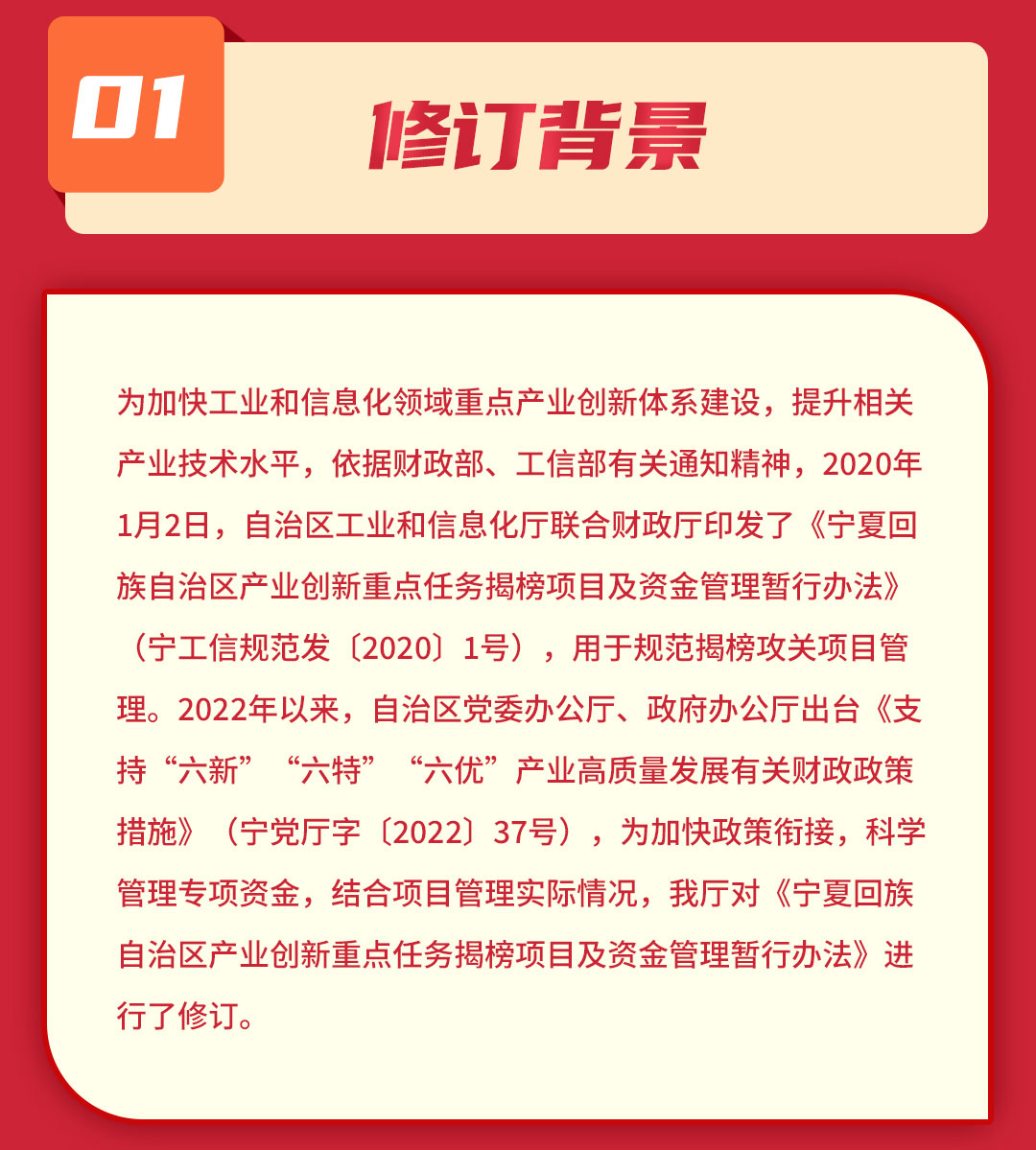 一图读懂 《自治区产业创新重点任务揭榜项目及资金管理办法》 发布日期:2023-05-29 20:26:57 宁夏回族自治区产业创新重点任务揭榜项目管理办法 上一条:一图读懂《宁夏回族自治区一般工业固体废物综合利用项目管理办法》 下一条:一图读懂《宁夏回族自治区制造业创新中心认定管理办法》 扫一扫在手机打开当前页 打印关闭
