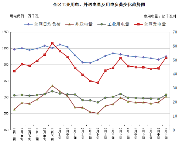 发用电信息:本旬,全网发电量51.67亿千瓦时,环比增长17.12%,同比增长20%;工业用电量25.17亿千瓦时,环比增长14.37%,同比下降1.9%;外送电量23.9亿千瓦时,环比增长20.5%,同比增长62.25%;全网日均用电负荷1052万千瓦,环比增长3.95%,同比下降1.96%。