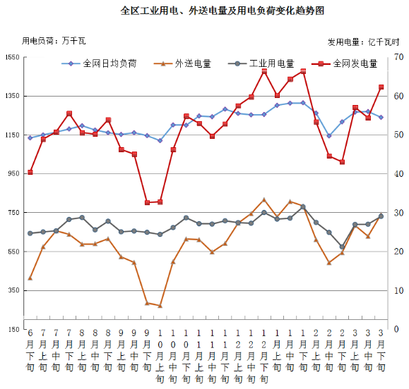 2021年3月下旬,我区外送电量、工业用电量同比环比均增长,全网日均用电负荷同比大幅增长、环比略降;大宗工业品价格同比全部上涨,环比小幅震荡;铁路运量同比环比均增长。