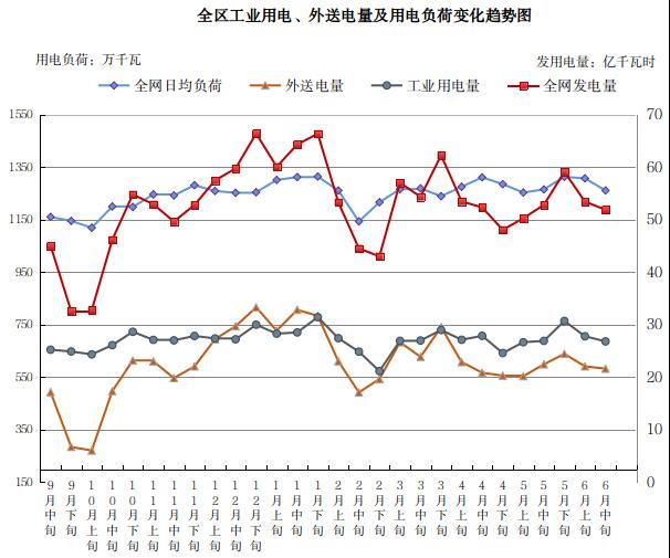 2021年6月中旬,全区工业经济稳中向好,工业用电量、外送电量、全网日均用电负荷环比略有回落,同比均保持两位数增长;大宗工业品价格同比除硅锰外均呈增长态势,环比小幅波动;铁路运量环比下降、同比增幅收窄。
